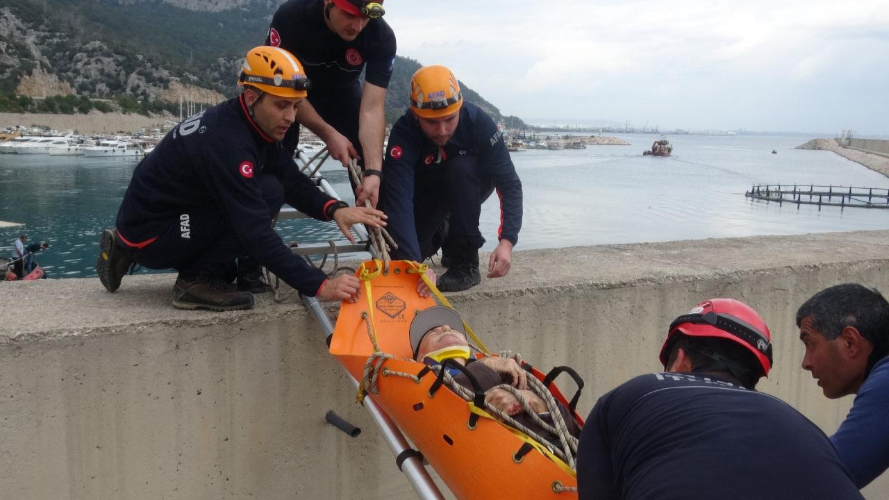 Antalya'da öğlen saat 12.30 sıralarında Konyaaltı ilçesi arkadaşı ile balık tutmak için Balıkçı Barınağı'na gelen Atilla Toprak (65), mendireğin deniz kısmına geçti. Dalga kıranın üzerinden kayarak düşen Toprak kayalıkların arasına sıkıştı. Durumu fark eden yaşlı adamın arkadaşı Tarık Çetin, 112 Acil Çağrı Merkezi'ni arayarak yardım istedi.