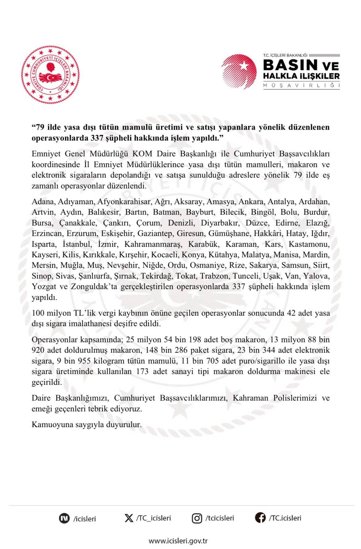 79 İlde Yasa Dışı Tütün Mamulü Üretimi ve Satışı yapanlara yönelik düzenlenen operasyonlarda 337 şüpheli hakkında işlem yapıldı. 100 Milyon TL'lik vergi kaybının önüne geçildi.