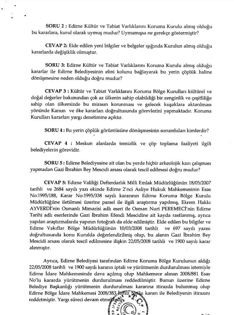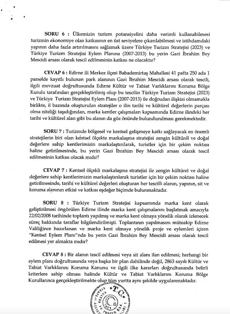 Kültür ve Turizm Bakanlığı, Edirne’de mülkiyeti belediyeye ait park alanının "Gazi İbrahim Bey Mescidi" olarak tescil edilmesi ile ilgili Edirne Milletvekili Bilgin Paçarız’ın 2009 yılında verdiği soru önergesine verdiği cevaplar ise şöyle: