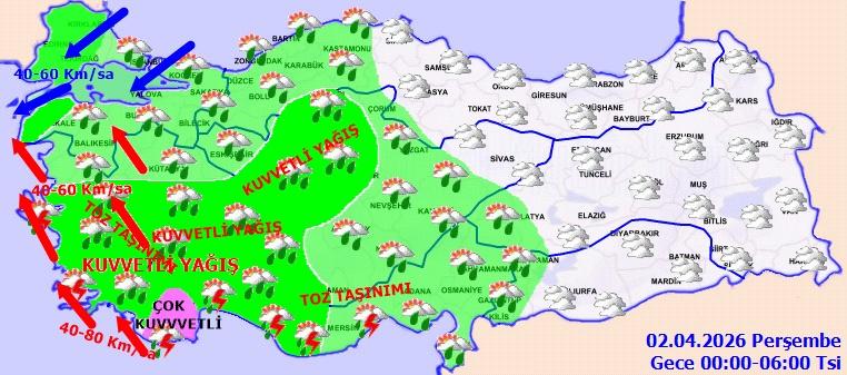 Ankara'daki kuvvetli sağanağın, zamanla il genelinde kısa süreli ve yerel gök gürültülü sağanak şeklinde etkili olacağı tahmin ediliyor.Gaziantep, Kilis, Adıyaman ve Şanlıurfa çevrelerinde yerel kuvvetli sağanak, Balıkesir'in batısı ve Çanakkale'de aralıklı ve yerel kuvvetli sağanak ve gök gürültülü sağanak bekleniyor.