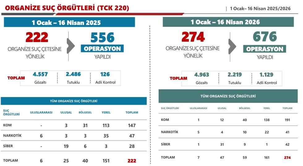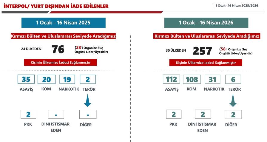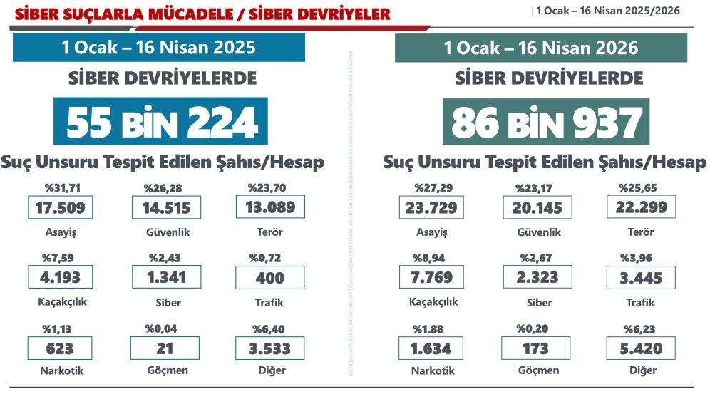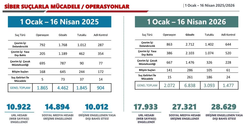 "Emniyet Genel Müdürlüğümüz Siber Suçlarla Mücadele Daire Başkanlığı koordinasyonunda 2025 yılında 210 bin 234, 2026 yılı 16 Nisan itibarıyla ise 86 bin 937 hesap yöneticisi veya kullanıcısı tespit edildi. Şanlıurfa Siverek ve Kahramanmaraş Onikişubat'taki okul saldırıları sonrasında saldırgan içerikli 481 hesap hakkında işlem başlatıldı. Toplamda 7 bin 755 URL için içerik çıkarılması veya erişim engellenmesi kararı uygulandı."