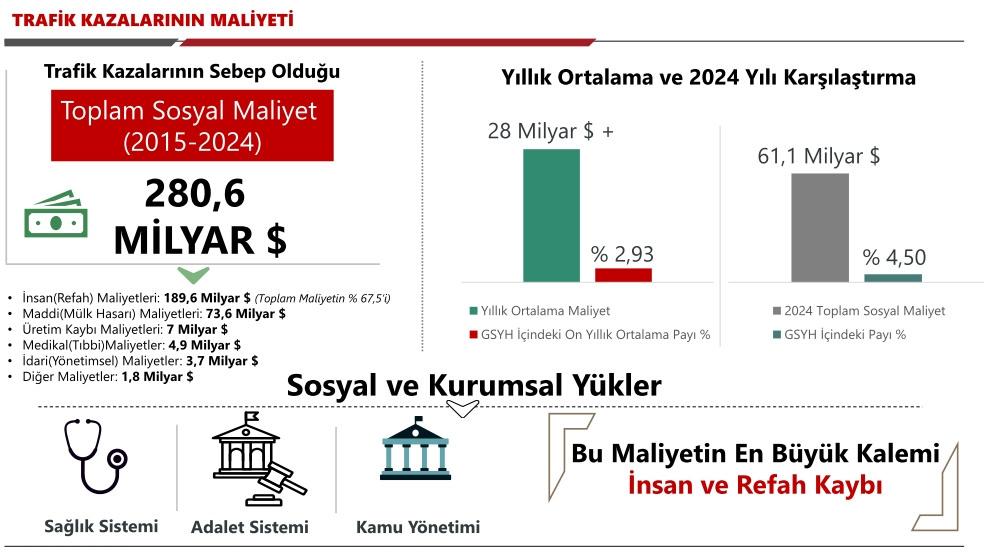 Günlük hayatın en büyük risk alanlarından biri olan trafik kazalarının faturası hem insani hem de ekonomik boyutta kendini gösteriyor. Toplantıda 2015-2024 yılları arasında trafik kazalarının sebep olduğu toplam sosyal maliyet 280,6 milyar dolar olarak ifade edildi.