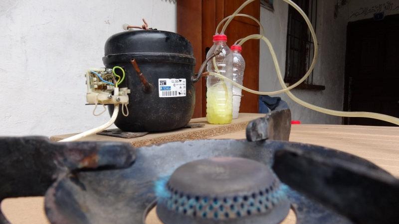 Karabük’te işçi emeklisi Sabri Cebeci, buzdolabı motorunu kullanarak, benzin ve su karışımıyla kurduğu sistemle kendi gazını üretti.