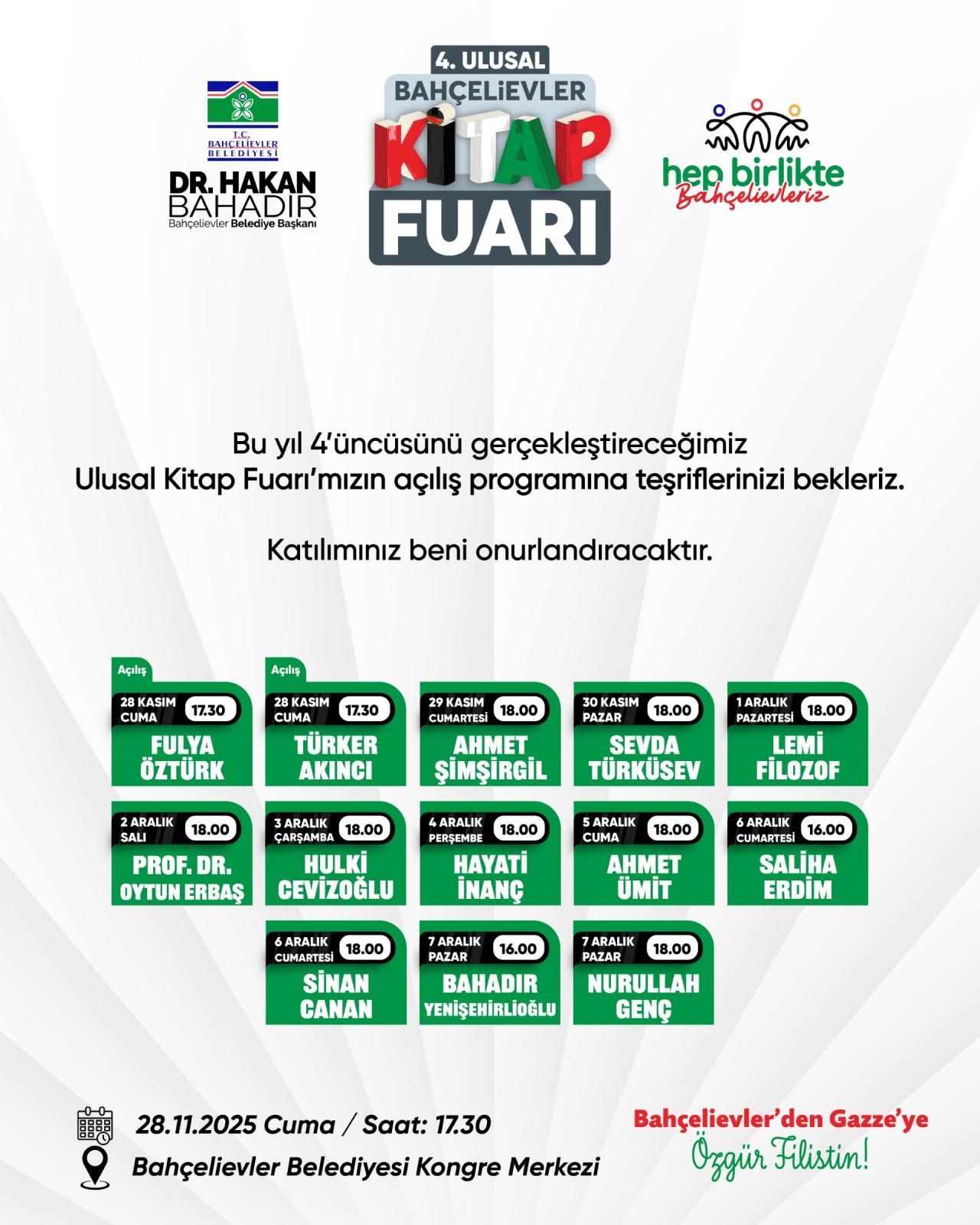 Bahçelievler Belediye Başkanı Dr. Hakan Bahadır, kitapların insanlığın ortak hafızası olduğunu vurgulayarak, kültürel mirası halkla buluşturmayı sürdüreceklerini ifade etti. Bu yıl fuarda 100’den fazla yayınevi, 1 milyon kitap ve 100’ün üzerinde yazar kitapseverlerle buluşacak.