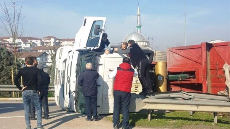 Alınan bilgiye göre, Gölcük’ten hurda yükleyip İzmit yönüne hareket eden Murat Özbay yönetimindeki 34 UB 6958 plakalı tır, Piyale Paşa Mahallesi mevkisinde D-130 karayoluna geçmek isterken virajı alamayarak yola devrildi.