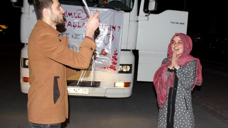 Konya'da nakliyecilik yapan genç, kız arkadaşının içinde bulunduğu otomobilin yolunu tırla kesip evlenme teklif etti.