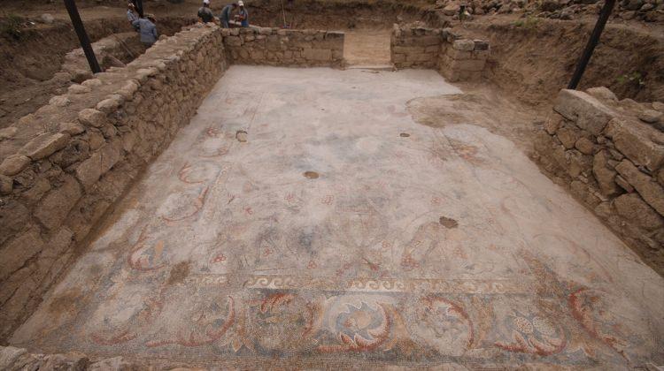 Konya'nın Beyşehir ilçesinde geçen yıl tespit edilen, üzerinde insan ve çeşitli hayvan figürlerinin yer aldığı, bin 400 yıllık olduğu değerlendirilen taban mozaiğinin bulunduğu yonca tarlasında kazı çalışmaları devam ediyor.