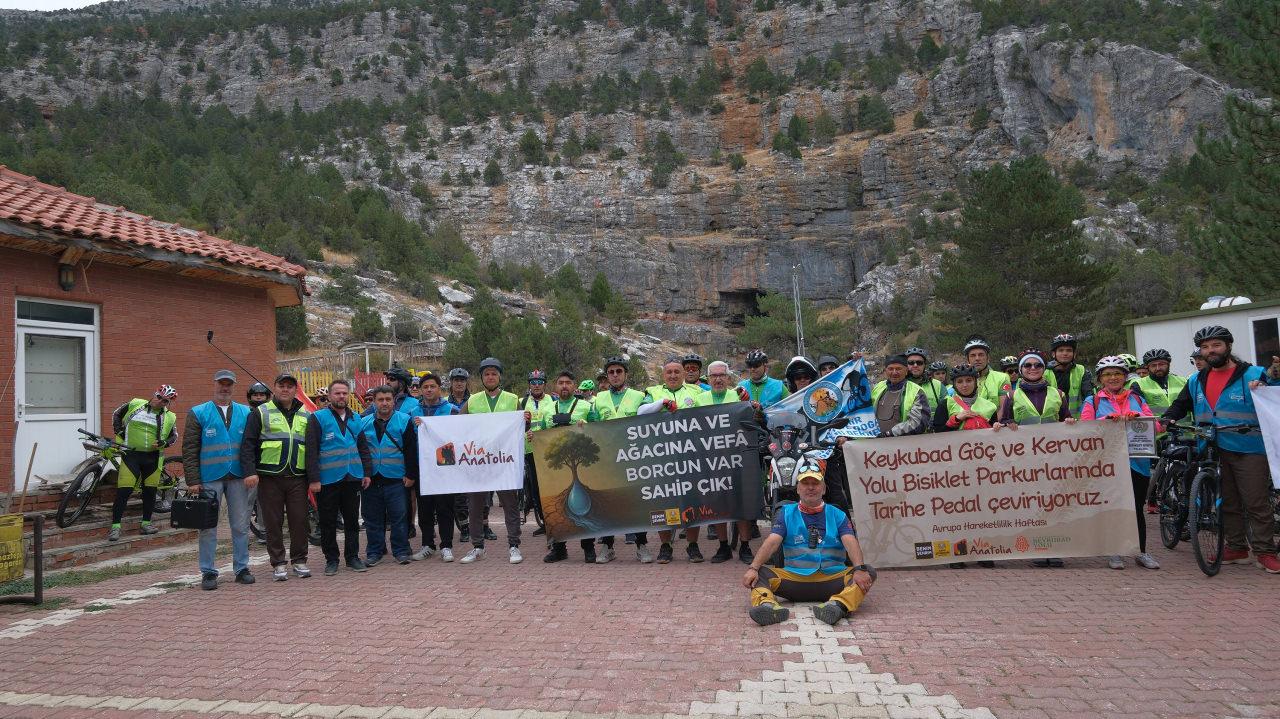 Bir kısmı Konya’dan Alanya’ya uzanan Keykubad Yolu üzerinde gerçekleştirilen “Keykubad’ın İzinde Pedallıyoruz” bisiklet etkinliğinde “Suyuna ve Ağacına Vefa Borcun Var Sahip Çık” teması ile yaşanan kuraklık ve orman yangınlarına da dikkat çekildi.