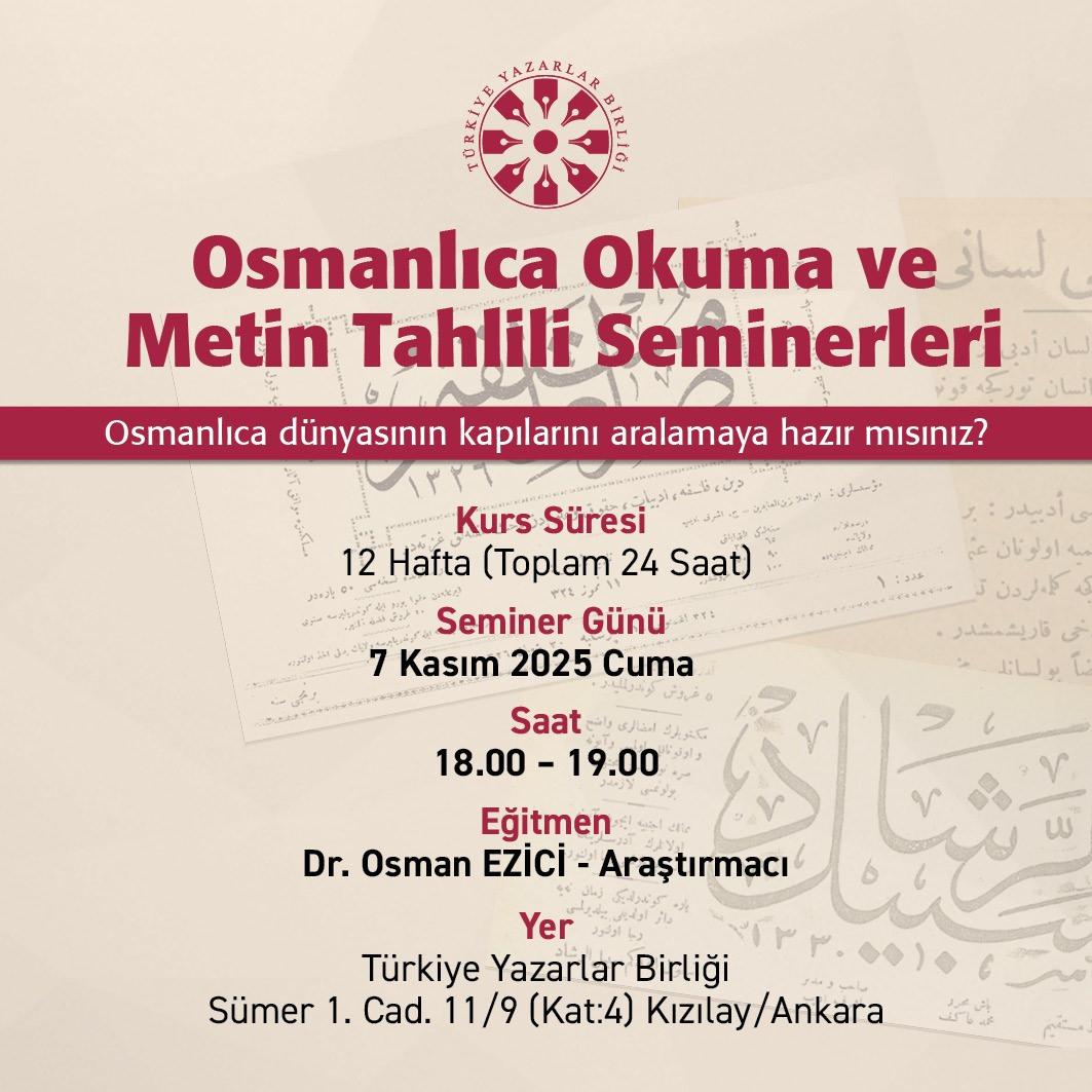 Kültür hayatımıza kazandırdığı eser ve etkinliklerle tanınan Türkiye Yazarlar Birliği, yoğun ilgi ve talep üzerine Osmanlıca derslerine yeniden başlıyor.