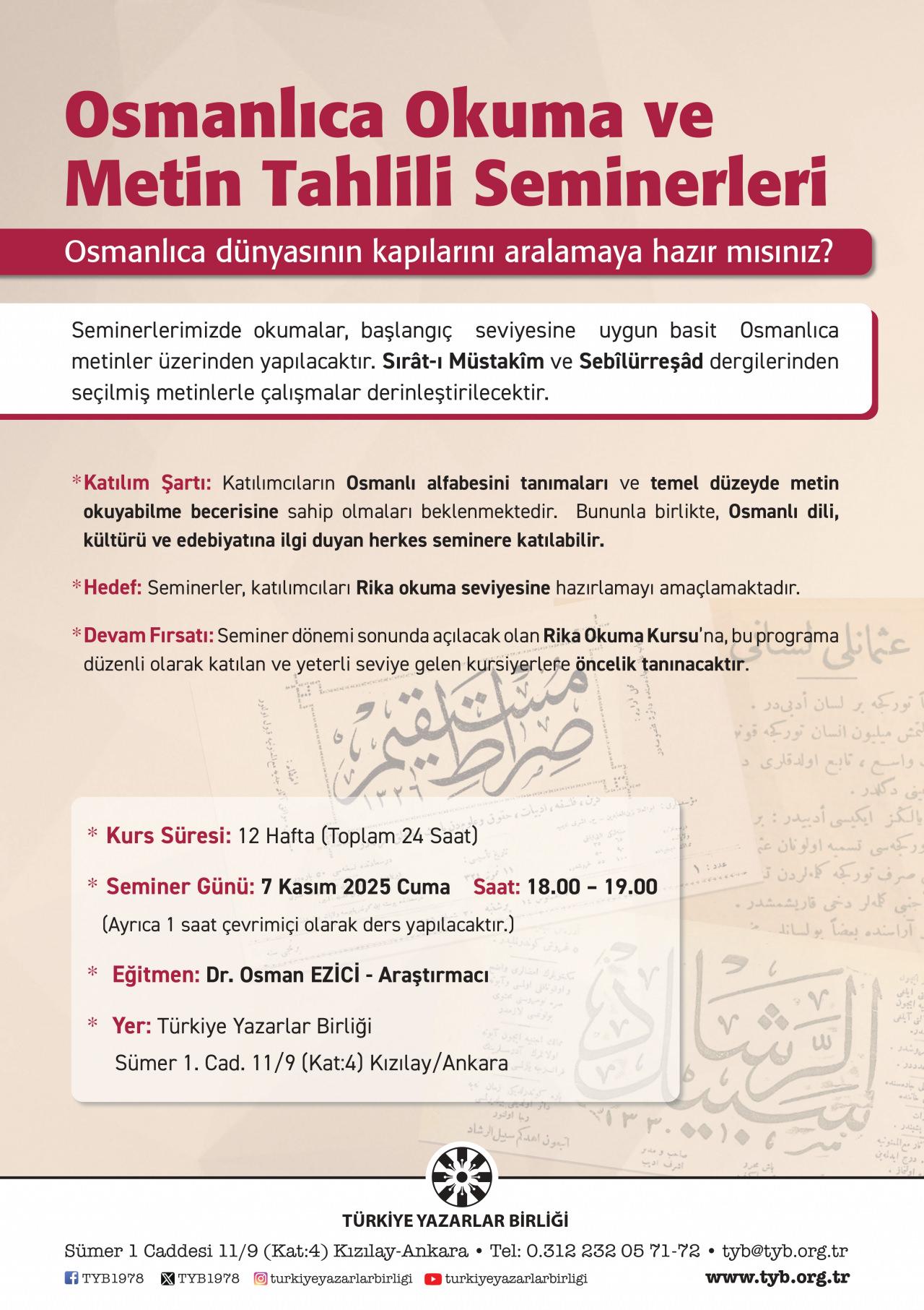 12 hafta sürecek ve katılım belgesi verilecek kursun ilk dersi 7 Kasım 2025 Cuma günü saat: 18.00'de; TYB Mehmet Âkif Divanı, Sümer 1 Cad. 11/9 Kızılay/Ankara adresinde yapılacak.