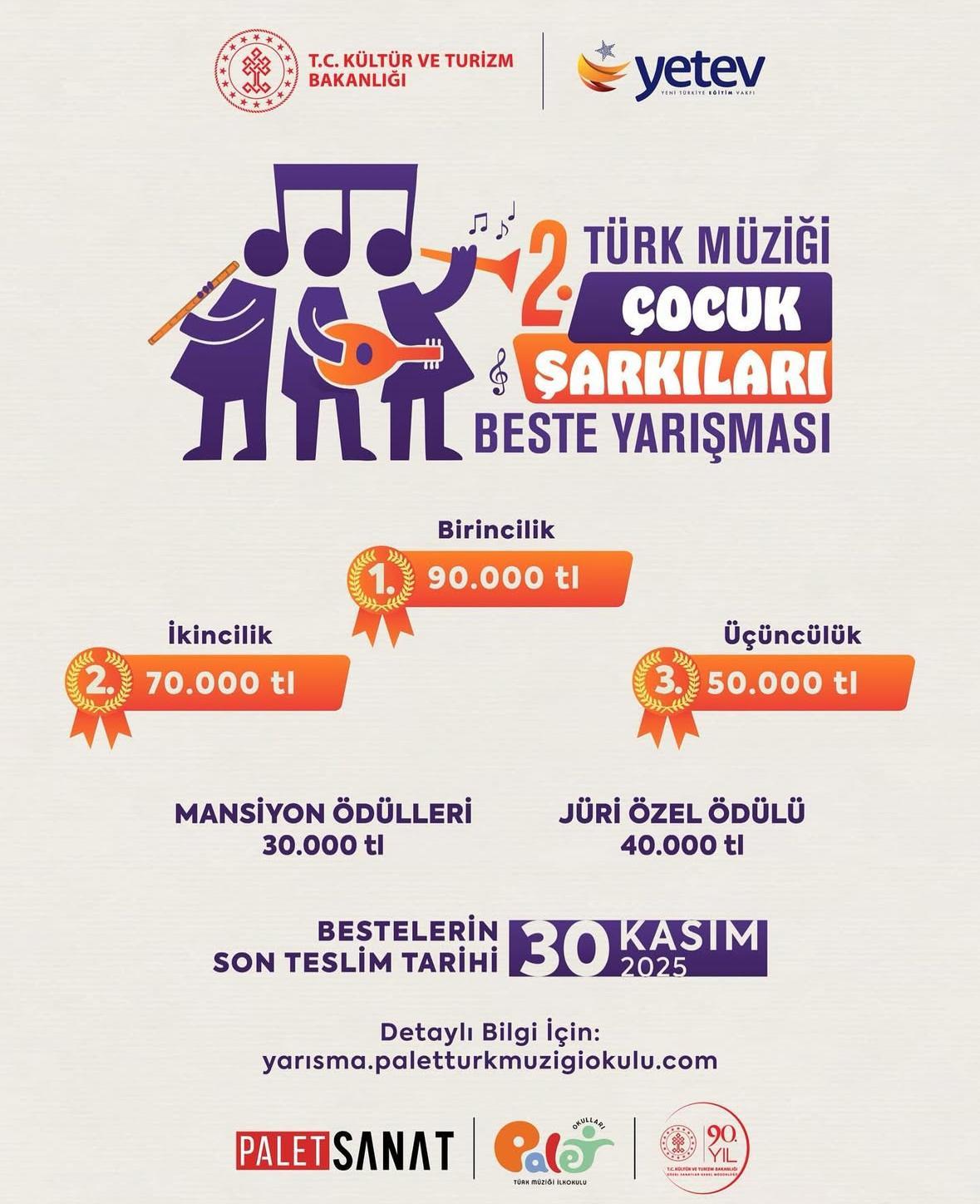 Yeni Türkiye Eğitim Vakfı’na bağlı Palet Türk Müziği İlkokulu ile Kültür ve Turizm Bakanlığı Güzel Sanatlar Genel Müdürlüğü iş birliğiyle düzenlenen “II. Türk Müziği Çocuk Şarkıları Beste Yarışması” için başvurular tüm hızıyla sürüyor.