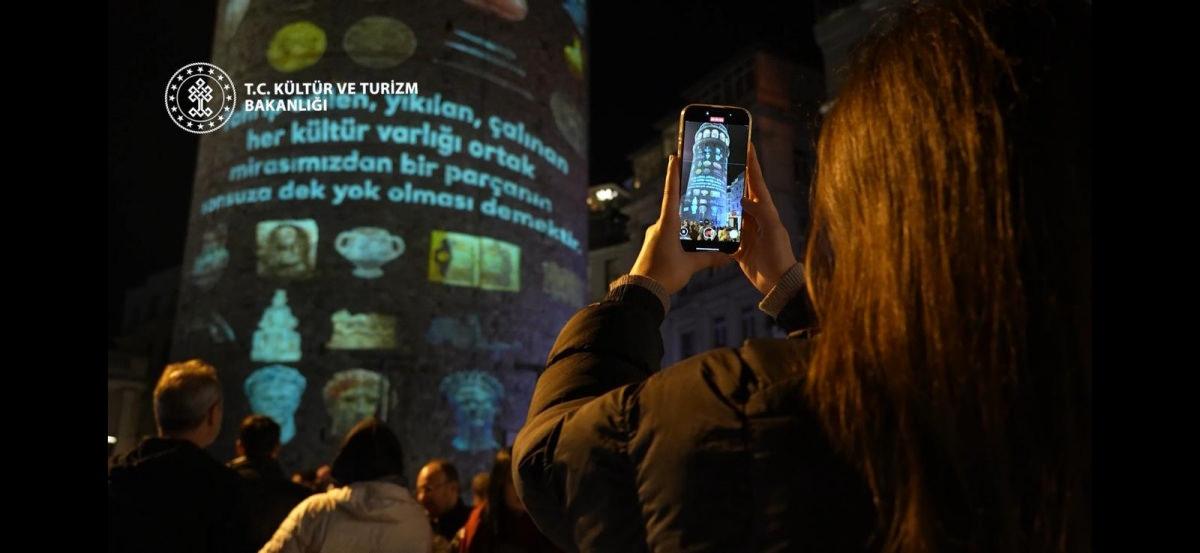 Yurtdışından geri getirilen kültürel miras eserlerinin görselleri, kaçakçılığa karşı farkındalık oluşturmak amacıyla kuleye yansıtıldı.