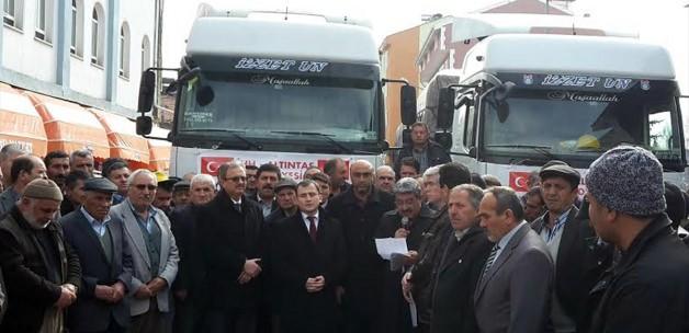 Yardım malzemelerinin bulunduğu 2 tır, yapılan duaların ardından yola çıktı.