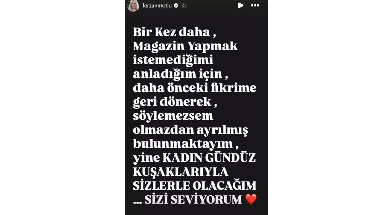 Söylemezsem Olmaz programında Nihat Doğan ile birlikte sunuculuk koltuğunda oturan Lerzan Mutlu’dan kimsenin beklemediği bir açıklama geldi. Sosyal medya hesabı aracılığıyla gerçekleştirdiği paylaşım ile programdan ayrıldığını duyuran Mutlu, magazin içerikli projelerde yer almak istemediğinin altını çizerek gündüz kuşağı programlarına geri döneceğini açıkladı.