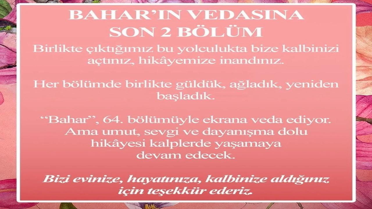 Birsen Altuntaş’ın haberine göre, yayın hayatına son yılların en yüksek izlenme oranlarıyla başlayan MF Yapım imzalı Bahar, 64. bölümde seyircisine elveda diyecek.