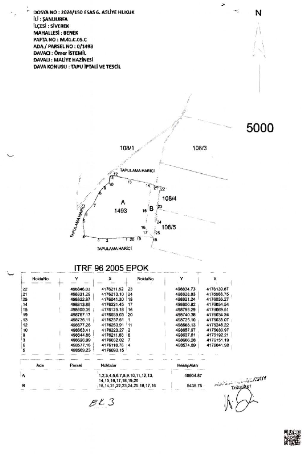 Dava konusu Şanlıurfa ili Siverek ilçesi Benek Mahallesi 1493 parsel sayılı (Kuzey, Güney ve Batısında tapulama harici yer, Doğusunda 108 ada 4 ve 5 nolu parsel sayılı taşınmaz ile çevrili alan) (fen bilirkişisi krokisinde A ve B harfi ile gösterilen alan) taşınmazın hissesi ile ilgili olarak mahkememizde tapu iptali ve tescil davası açılmış olup yargılamanın halen mahkememizin 2024/72 Esas sayılı dosyası üzerinden yürütüldüğü, ilan tarihinden itibaren (mahallinde 3 kez yapılacak ilanın sonuncusundan itibaren) 3 ay içerisinde bu yerde hak iddia edenler tarafından veya tescil koşulları gerçekleşmediğinden bahisle itiraz edilmediği takdirde bu yerin davacı adına tesciline karar verileceği T.M.K'nun 713/4. maddesi uyarınca ilan olunur.