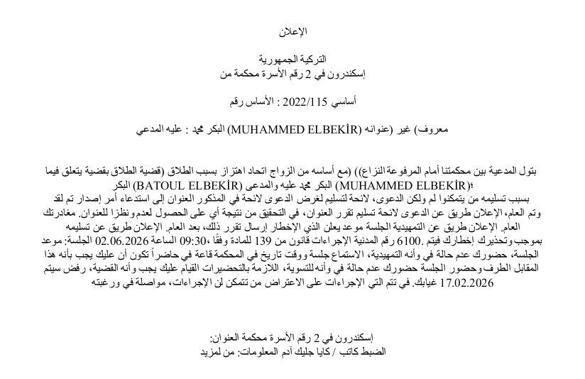 Davacı , BATOUL ELBEKİR ile Davalı , MUHAMMED ELBEKİR arasında mahkememizde görülmekte olan Boşanma (Evlilik Birliğinin Temelinden Sarsılması Nedeni İle Boşanma (Çekişmeli)) davası nedeniyle;