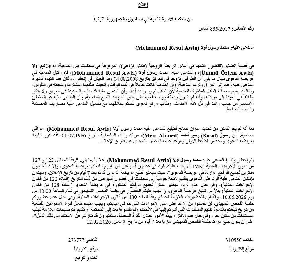 HABERLER RESMİ İLANLAR İstanbul 2. Aile Mahkemesi GİRİŞ 22.04.2026 00:00 Facebook'ta Paylaş X'te Paylaş #İlangovtr Basın no ILN02452636
