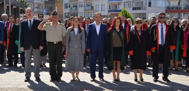 Cumhuriyet Başsavcısı Ozan Kaya ve Baro Başkanı Hicran Kandemir'in çelenkleri bırakmasının ardından saygı duruşunda bulunularak İstiklal Marşı okundu