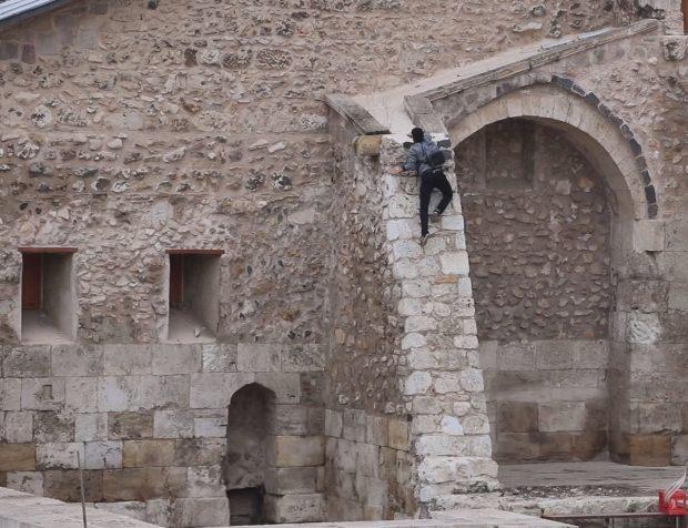 Sivas’ta 750 yıllık Çifte Minareli Medrese’nin demir parmaklıklarla kapalı duvarına tırmanan çocukların tehlikeli oyunu yürekleri ağza getirdi.