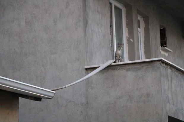 Daha sonra durumu fark eden hayvansever bir genç kedinin mahsur kaldığı apartmanın bitişiğinde bulunan apartmanın çatısından balkona merdiven dayadı. Yaklaşık 10 metrelik bir yükseklikten canını hiçe sayarak geçen hayvansever genç dayadığı merdivenden balkona girerek kediyi kurtardı.