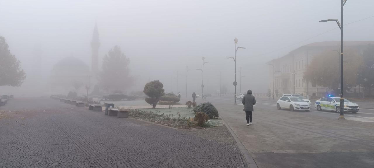 Sivas'ta sıcaklıkların eksi 3 dereceye düşmesiyle birlikte kent, görüş mesafesini neredeyse yok eden yoğun sis örtüsünün altında kaldı.