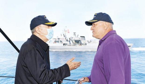 Sancak gemisi Salihreis’in pruvasından Rodos’a doğru bakarken Bakan Akar şöyle diyor: