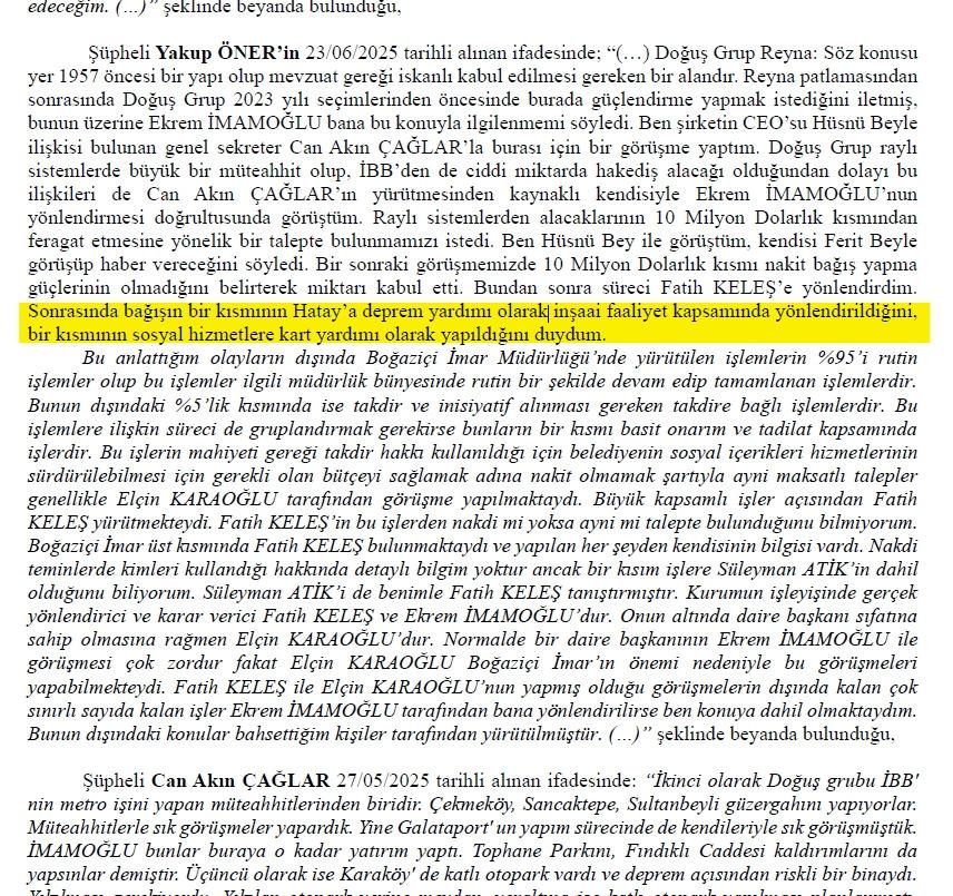 “(...)2023 yılının ikinci yarısında Saraçhane’de bir toplantıda ben, Can Akın Çağlar, Ekrem İmamoğlu ile birkaç kişinin daha bulunduğu yerde Ekrem İmamoğlu Can Akın Çağlar’a Doğuş ile olan 10 milyon dolarla ilgili ne yaptın diye sordu. Can Bey ben görüşüyorum, resmi olarak bu parayı nasıl tahsil edeceğimizi şirketin CEO’su Hüsnü Bey ile görüştüklerini söyledi. Ekrem İmamoğlu paranın tamamını resmi vermelerine gerek yok, büyük bir kısmını gayri resmi alalım, seçimler yaklaşıyor para ihtiyacı olacak şeklinde konuştu. Söz konusu konuşma bu kadar gerçekleşti başka bir detay vermedikleri için hangi iş kapsamında bu paranın istendiğini bilmemekle beraber Can Akın Çağlar’ın bu şirket ile birkaç kez görüştüğünü biliyorum(...)” ifadelerini kullandı.