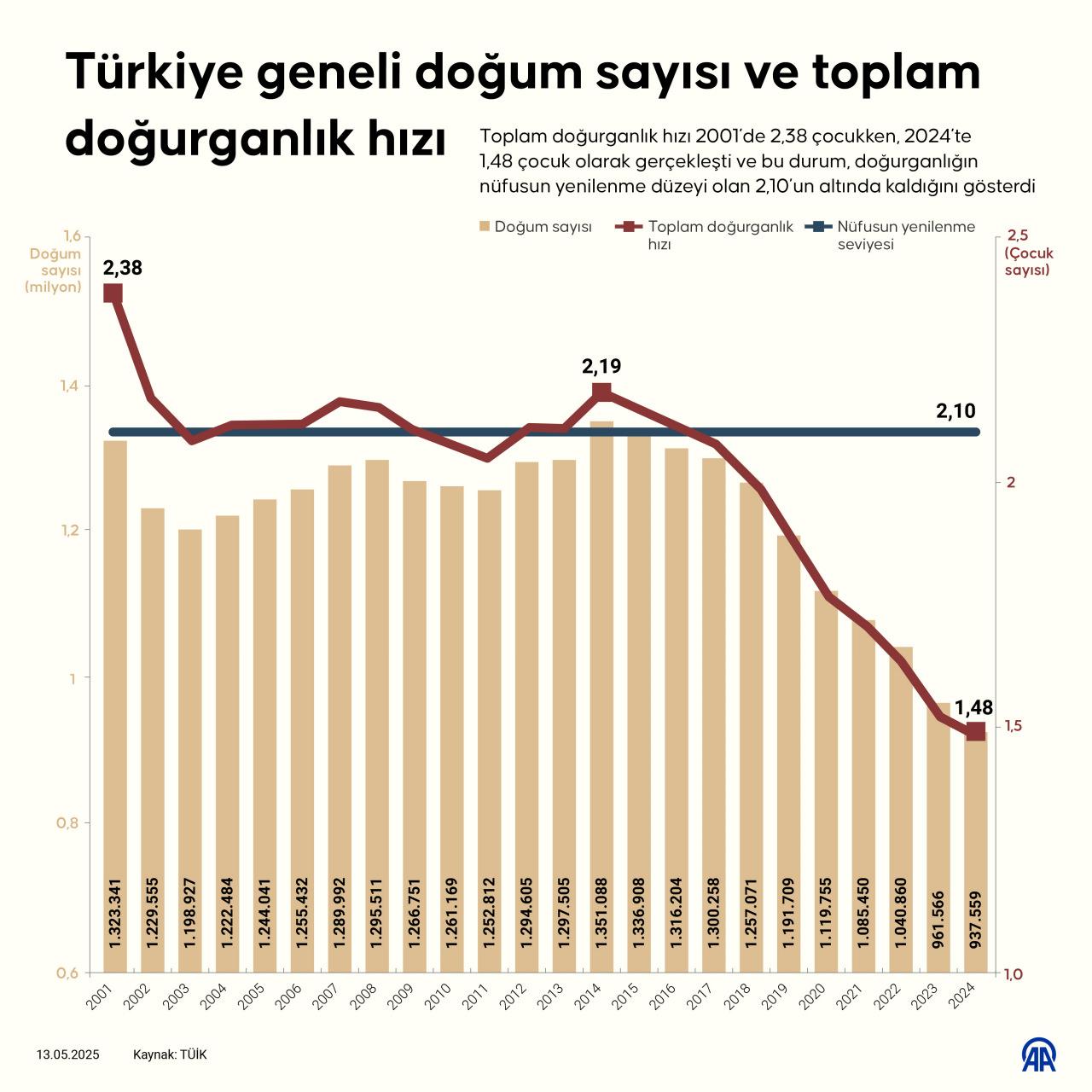 Türkiye'nin nüfusunun arttığını, fakat nüfus artış hızının azaldığını vurgulayan Erdoğan, "Toplam doğurganlık oranı nüfusun kendisini yenileme seviyesinin altında gerçekleşiyor. TÜİK'in açıkladığı verilere göre, geçtiğimiz yıl ölçülen toplam doğurganlık hızı 1,48. Şu anda bir felaketi yaşıyoruz. Bu oran nüfusun kendisini yenileme düzeyi olan 2,10 bandının çok altında. Geleceğimiz açısından alarm zilleri hem de çok yüksek sesle çalıyor. Bu ülkenin istikbalini düşünen hiç kimse buna kayıtsız kalamaz." diye konuştu.