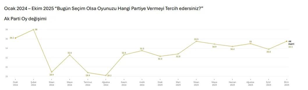 Partinin oyları yeniden 34–36 bandına oturmuş durumda ve siyasal şartlar olgunlaştığında 38–40 bandına doğru bir sıçrama potansiyeli taşıyor.