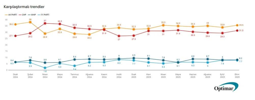 Türk siyasetinde, 2024’ten bu yana yaşanan dalgalanmalar seçmenin ne kadar hızlı yön değiştirdiğini değil; hangi eksende konumlandığını gösteriyor. Optimar’ın Ocak 2024 – Ekim 2025 verileri, yüzeydeki tartışmaların ötesine geçildiğinde seçmenin aslında oldukça tutarlı bir mesaj verdiğini teyit ediyor. Bu mesajın özeti şu: