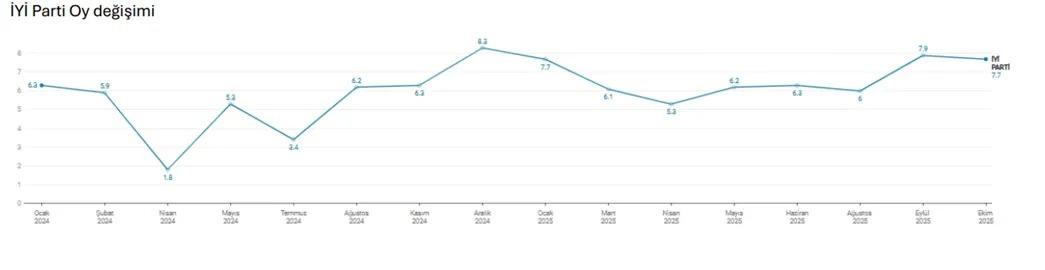 Veriler, İYİ Parti’nin 1,8’lik dipten 7–8 bandına yükseldiğini gösteriyor; ancak bu artış partiyi merkezi aktör yapmaya yetmiyor.