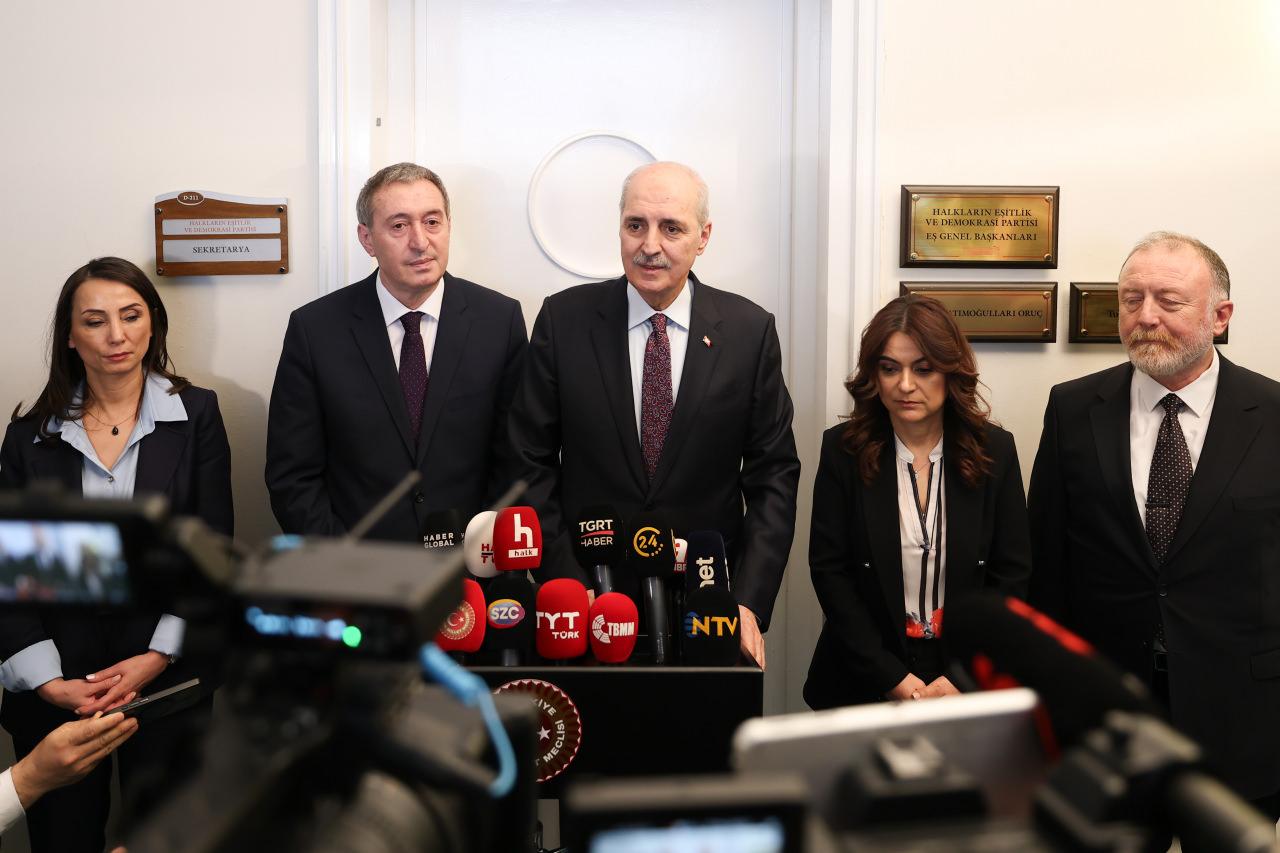 TBMM Başkanı Kurtulmuş, görüşmenin ardından gazetecilere yaptığı açıklamada, Milli Dayanışma, Kardeşlik ve Demokrasi Komisyonu sürecinde verdikleri destek dolayısıyla DEM Parti’ye teşekkür etti.