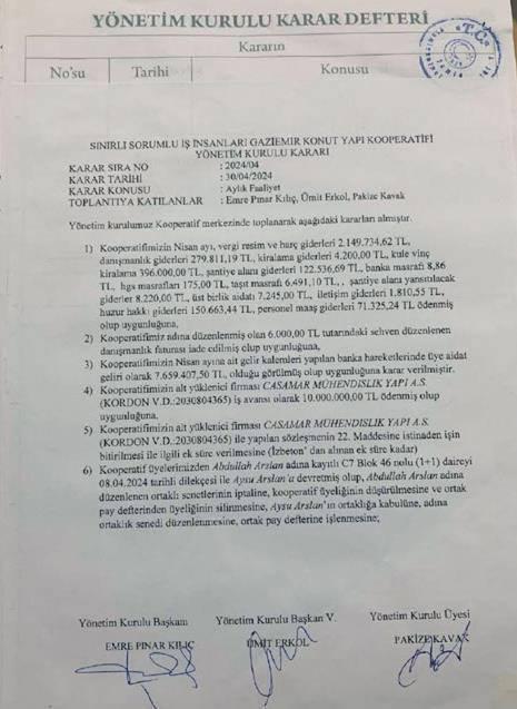 Ümit Erkol'un Gaziemir Konut Yapı Kooperatifi'nin yönetim kurulu kararlarının hepsinde Yönetim Kurulu Başkan Vekili olarak ıslak imzalarının bulunduğu belgeler ortaya çıktı.