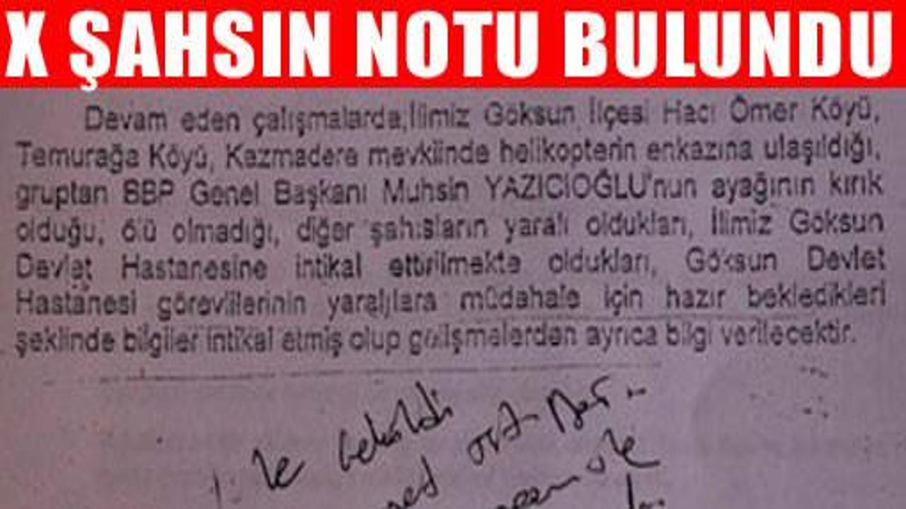 BBP lideri Muhsin Yazıcıoğlu'nun hayatını kaybettiği helikopter kazasında, Kahramanmaraş Emniyetince gönderilen 'Enkaza ulaşıldı, Yazıcıoğlu yaşıyor, ayağı kırık' biçimindeki istihbarat notu bulundu.