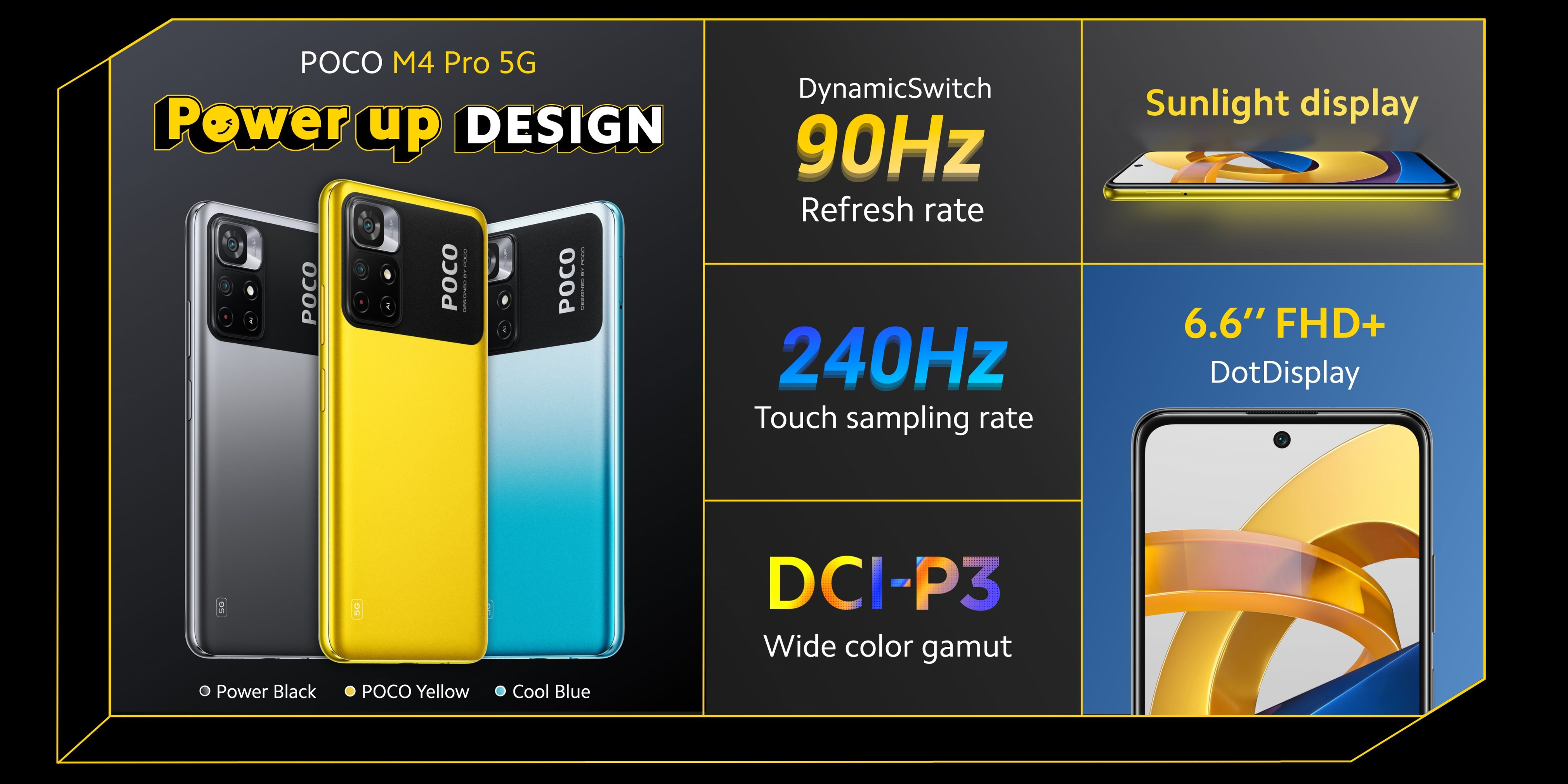 Akıllı telefon kutudan Android 11 tabanlı MIUI 12.5 arayüzü yüklü şekilde çıkıyor. Poco M4 Pro 5G'ün siyah, mavi ve sarı olmak üzere üç renk seçeneği mevcut. Cihaz donanım konfigürasyonuna göre farklılık gösteren iki farklı versiyon olarak sunulacak.