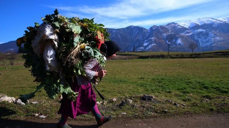 Trabzon'da da Düzköy ilçesine bağlı yaklaşık bin rakımlı Çayırbağı Mahallesi'ndeki kadınlar, bölgenin zorlu koşullarına, dik yamaçlarına aldırış etmeden çalışıyor.
