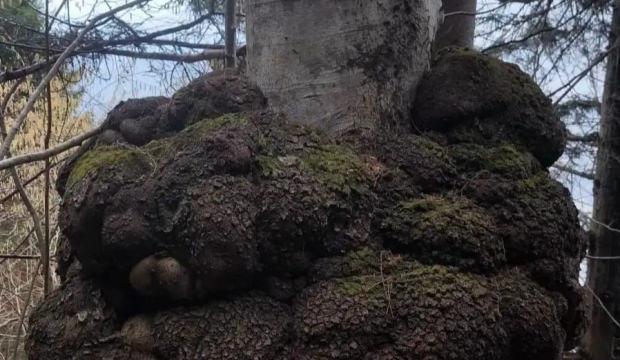 Ağacın bakteri, mantar veya fiziksel yaralanmalara karşı kendini korumak için hücrelerini kontrolsüzce büyütmesiyle oluşan bu kütle, Araklı'da bulunan bu örnekte devasa boyutlara ulaşmış durumda.
