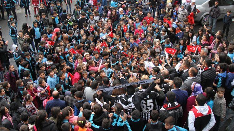 öğrenciler tarafından Beşiktaş bayraklarıyla karşılanan Dernek Başkanı İlker Bayram ve yönetim kurulu üyeleri, okulun toplantı salonunda düzenlenen programda, öğrencilere hediyelerini verdi.
