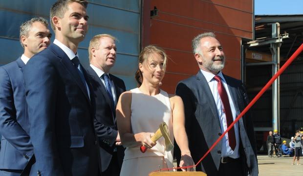 Yalova'nın Altınova ilçesindeki Cemre Tersanesi'nde Fransız firması için inşa edilen rüzgar türbini destek gemisi düzenlenen törenle denize indirildi.