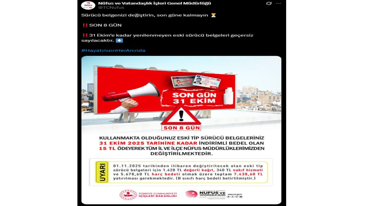 Yetkililer, sürücülerin işlemlerini son güne bırakmamaları gerektiğini hatırlatarak, 31 Ekim 2025 tarihine kadar tüm il ve ilçe nüfus müdürlüklerinde 15 TL karşılığında ehliyet yenileme işleminin gerçekleştirilebileceğini bildirdi.