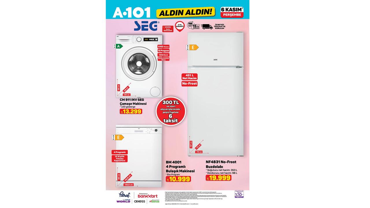 A101'e 6 Kasım Perşembe tarihinden itibaren çamaşır makinesi, no-frost buzdolabı, 4 programlı bulaşık makinesi cazip fiyatlarla raflarda yer alacak. Öte yandan cep telefonu, bluetooth kulak içi kulaklık ve bluetooth RGB hoparlörde de kaçırılmayacak indirim uygulanacak.