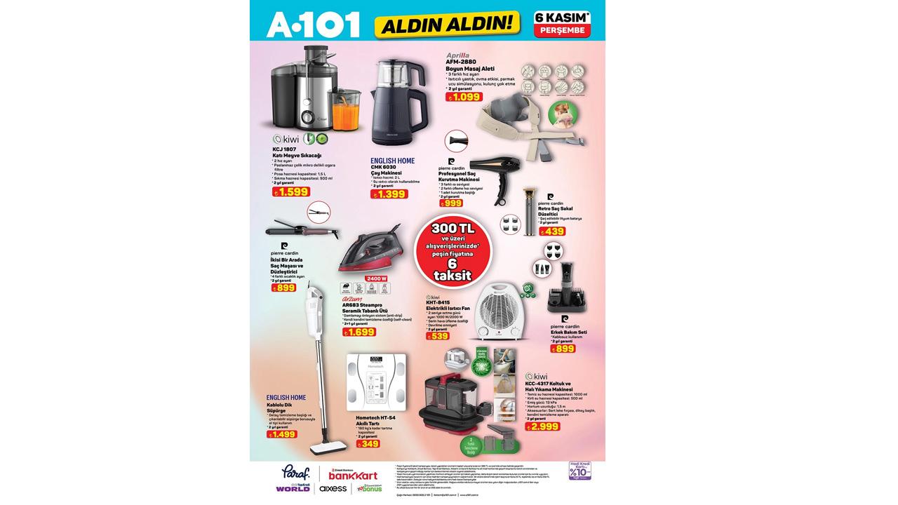 A101, 6 Kasım Perşembe'den itibaren geçerli kampanyasında, boyun masaj aleti, çay makinesi, katı meyve sıkacağı, ikisi bir arada saç maşası ve düzleştirici, profesyonel saç kurutma makinesi, saç sakal düzeltici, seramik tabanlı ütü, erkek bakım seti, elektrikli ısıtıcı fan, kablolu dik süpürge, akıllı tartı, koltuk ve halı yıkama makinesi gibi ürünler indirimli fiyatlarla satışa sunulacak.