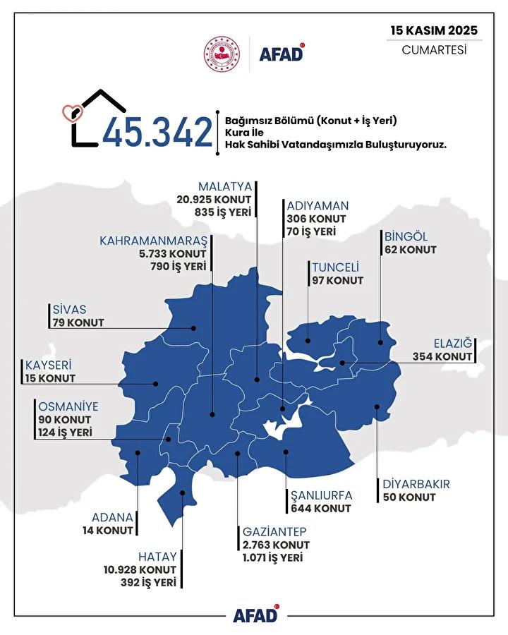 Toplam 42 bin konut için kura çekilişi tamamlandı. Kahramanmaraş, Gaziantep, Hatay ve Malatya illerinde afetten etkilenen hak sahipleri, bu kapsamda belirlendi.