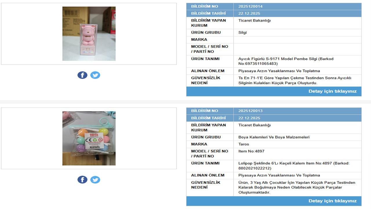 22 Aralık tarihli açıklamaya göre, çocukların kullanımına sunulan iki farklı kırtasiye ürünü için piyasadan toplatma süreci başlatıldı. Bu ürünlerin özellikle küçük yaştaki çocuklar açısından ciddi güvenlik riski taşıdığı belirtildi.