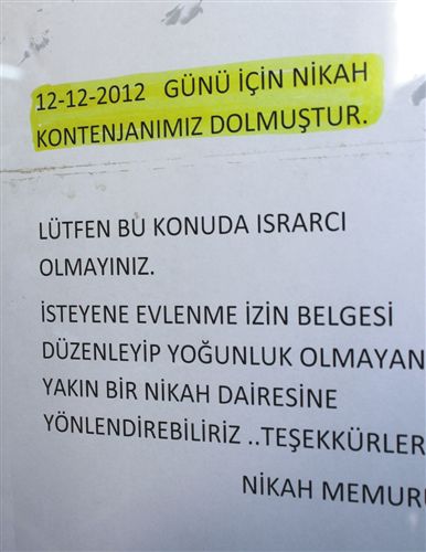 Evlilik tarihlerinin özel olmasını ve unutulmamasını isteyen Ordulu çiftler, bahar aylarında başlayıp yaz ayının sonuna kadar devam eden düğün sezonu yerine 12.12.12 tarihine rağbet edince o günün nikah kontenjanı doldu. Belediye, çareyi dairenin camına yazı asmakta buldu.
