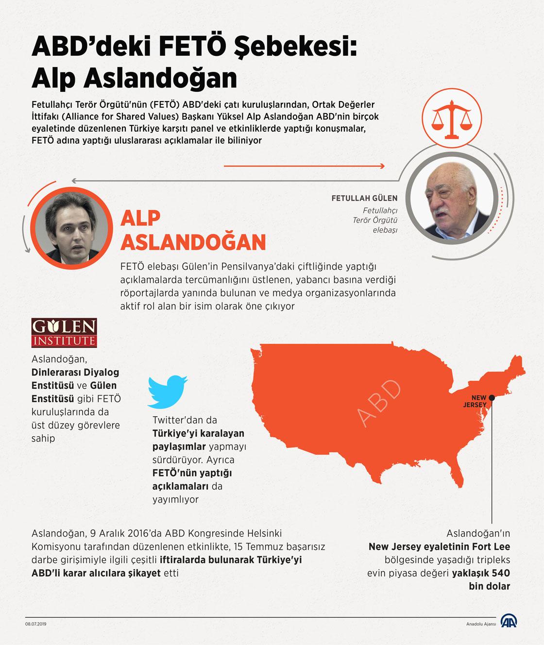 FETÖ’nün ABD’deki çatı kuruluşlarından Ortak Değerler İttifakı’nın (Alliance for Shared Values) başkanı olan Alp Aslandoğan, örgütün “sözcüsü” konumunda, yıllarca elebaşı Fetullah Gülen’e en yakın isimlerden biri olarak öne çıktı.