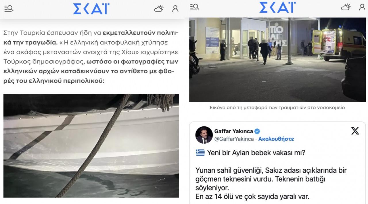 Türkiye'de trajediyi siyasi olarak istismar etmek için acele edenler çıktı bile. Bir Türk gazeteci, "Yunan sahil güvenlik ekipleri Sakız Adası açıklarında bir göçmen teknesine çarptı" iddiasında bulundu ; ancak Yunan yetkililerinden gelen fotoğraflar bunun tam tersini gösteriyor ve Yunan devriye botunun hasar gördüğünü ortaya koyuyor.