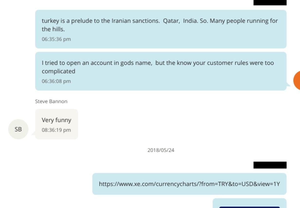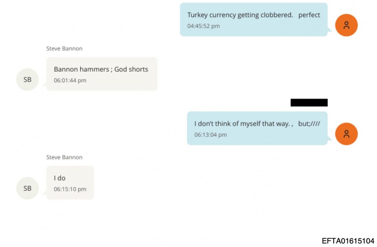 Epstein belgeleri arasında, başka bir dosyada yer alan daha ileri tarihli bir belgede ise Steve Bannon'nun kimliği belirsiz bir kişi ile Türk lirasına yaptıkları büyük operasyonu konuştukları ve kendilerini “tanrı” olarak niteledikleri görülüyor.