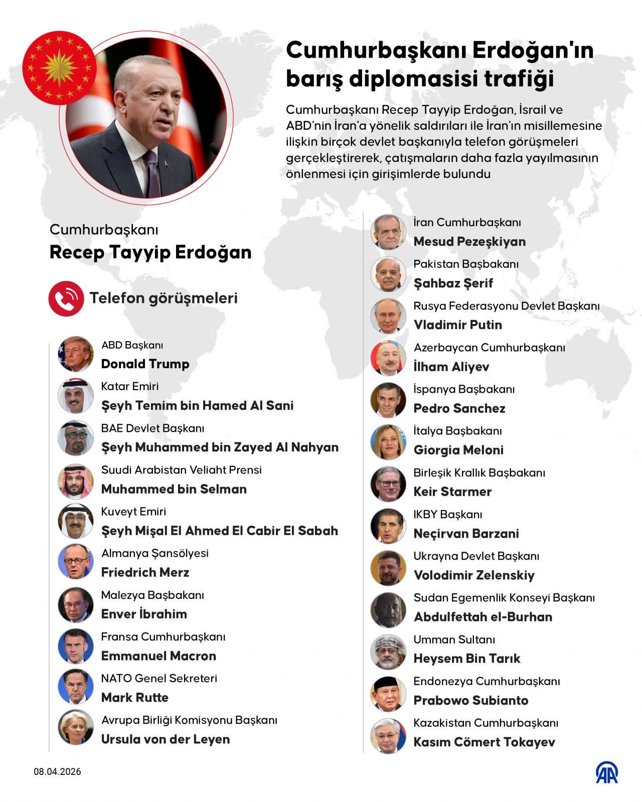 En başta, Cumhurbaşkanı Tayyip Erdoğan, savaşan taraflardan ABD Başkanı Donald Trump ve İran Cumhurbaşkanı Mesud Pezeşkiyan başta olmak üzere, 23 liderle görüşmeler yaptı.
